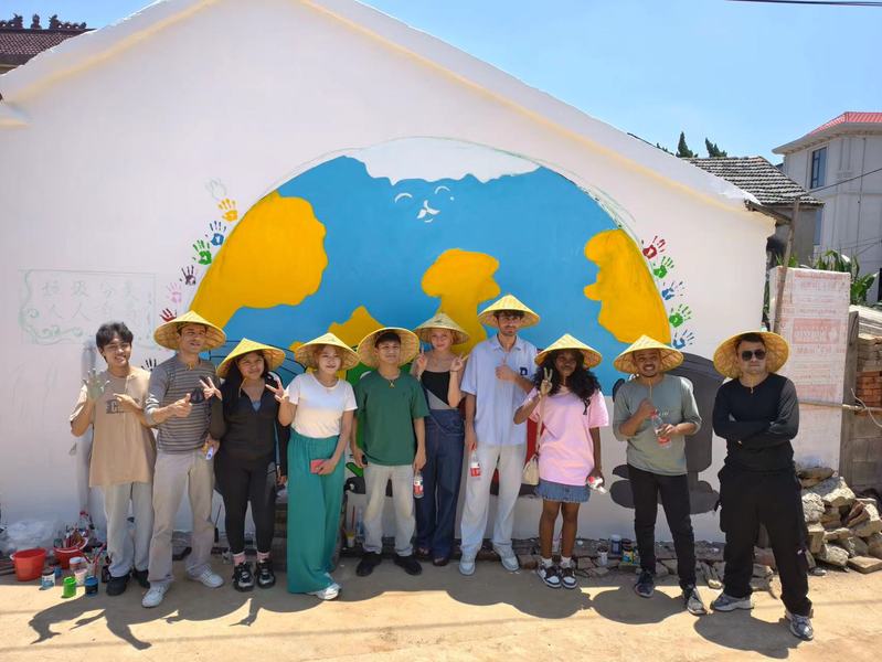 7月4日,在铜陵学院就读的10多名国际留学生前往铜陵市郊区灰河乡开展乡村振兴主题社会实践活动,用手中的画笔为乡村增添色彩。