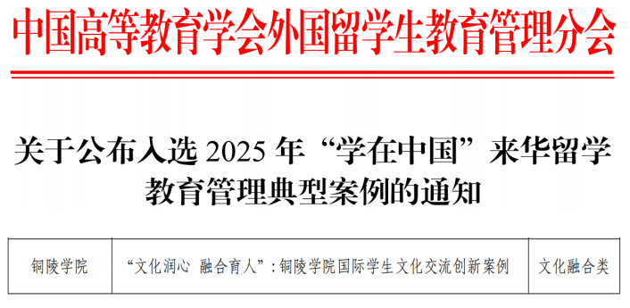 近日,中国高等教育学会外国留学生教育管理分会公布入选2025年“学在中国”来华留学教育管理典型案例,我校申报的“‘文化润心 融合育人’铜陵学院国际学生文化交流创新案例”成功入选其中。